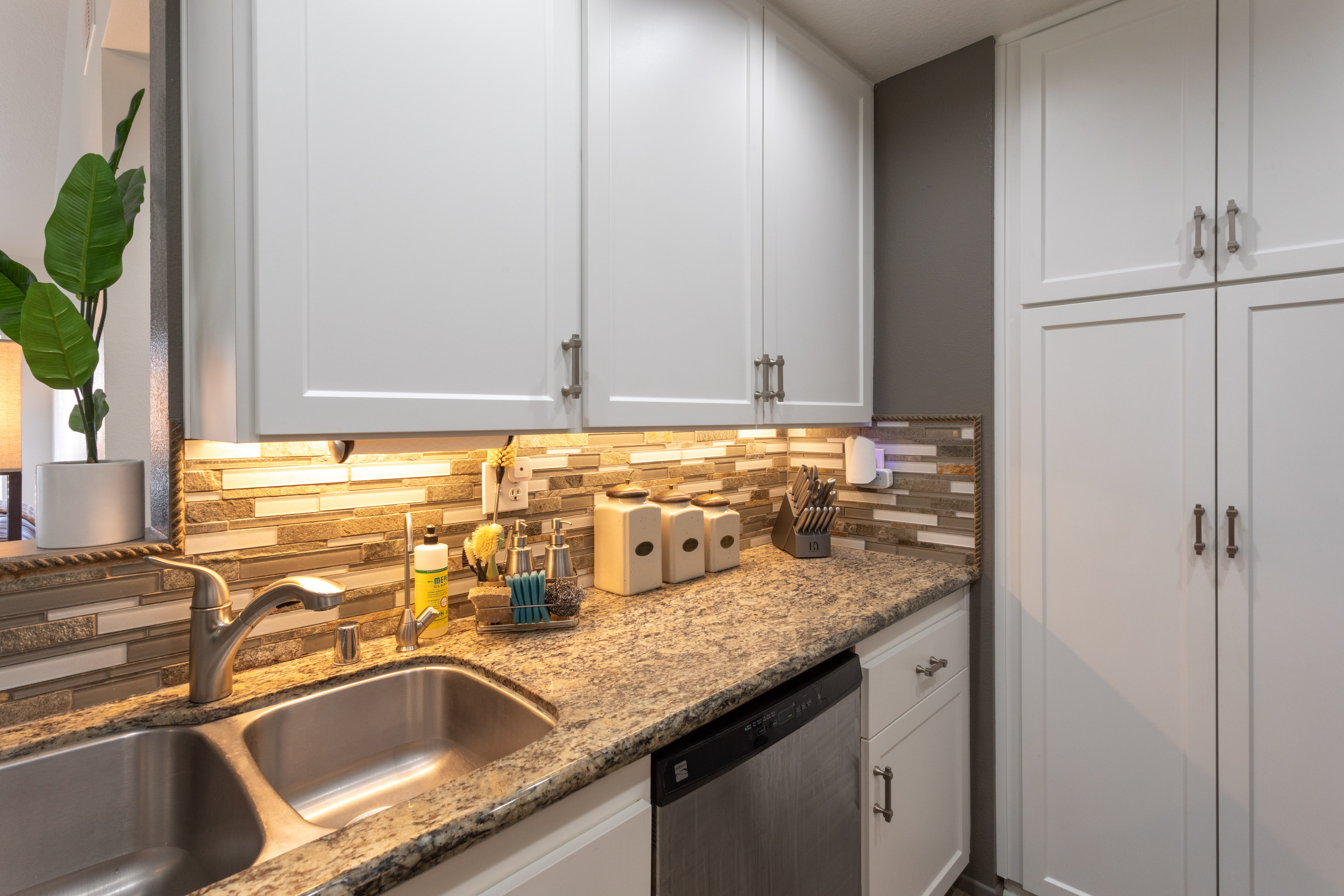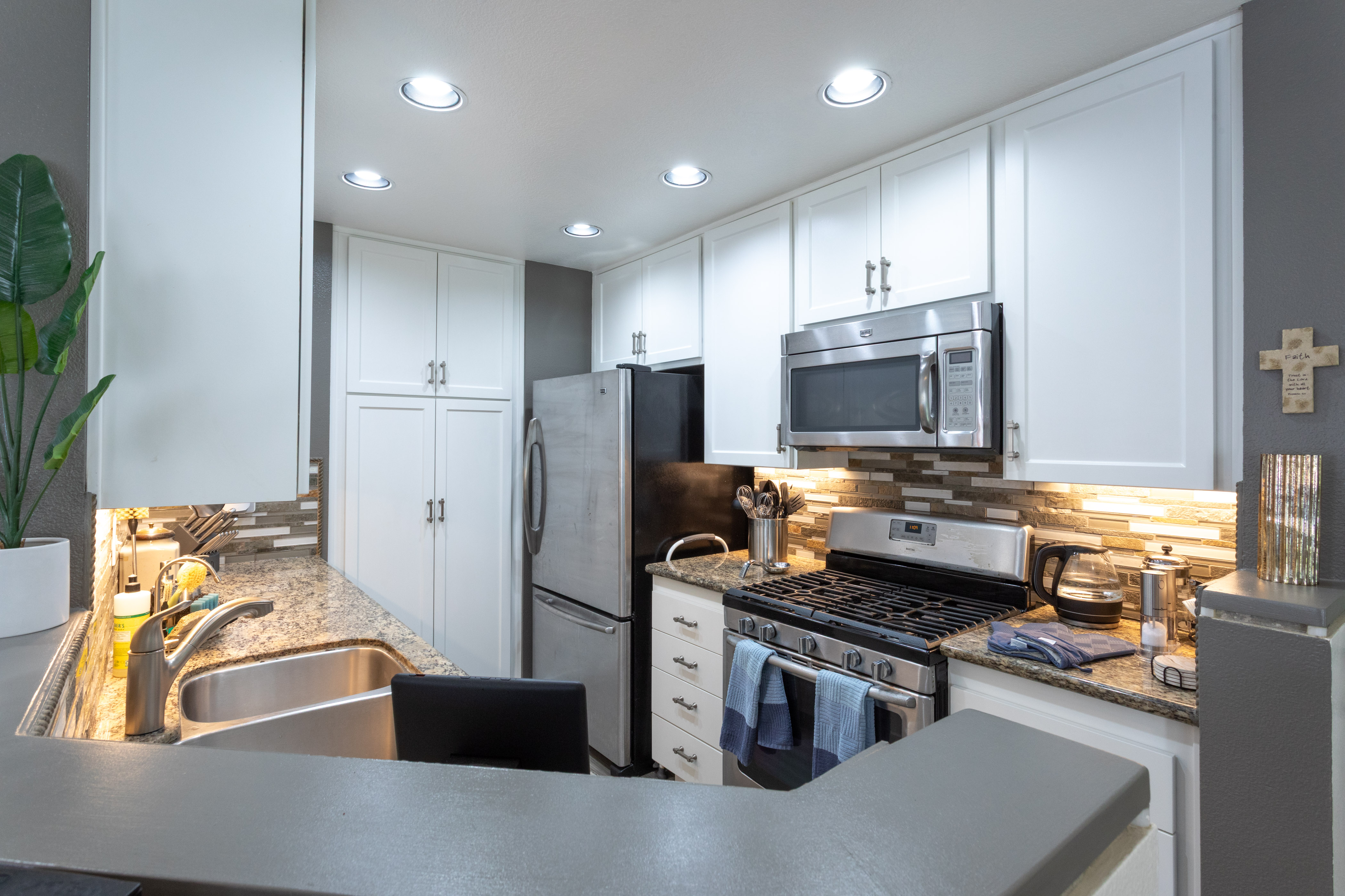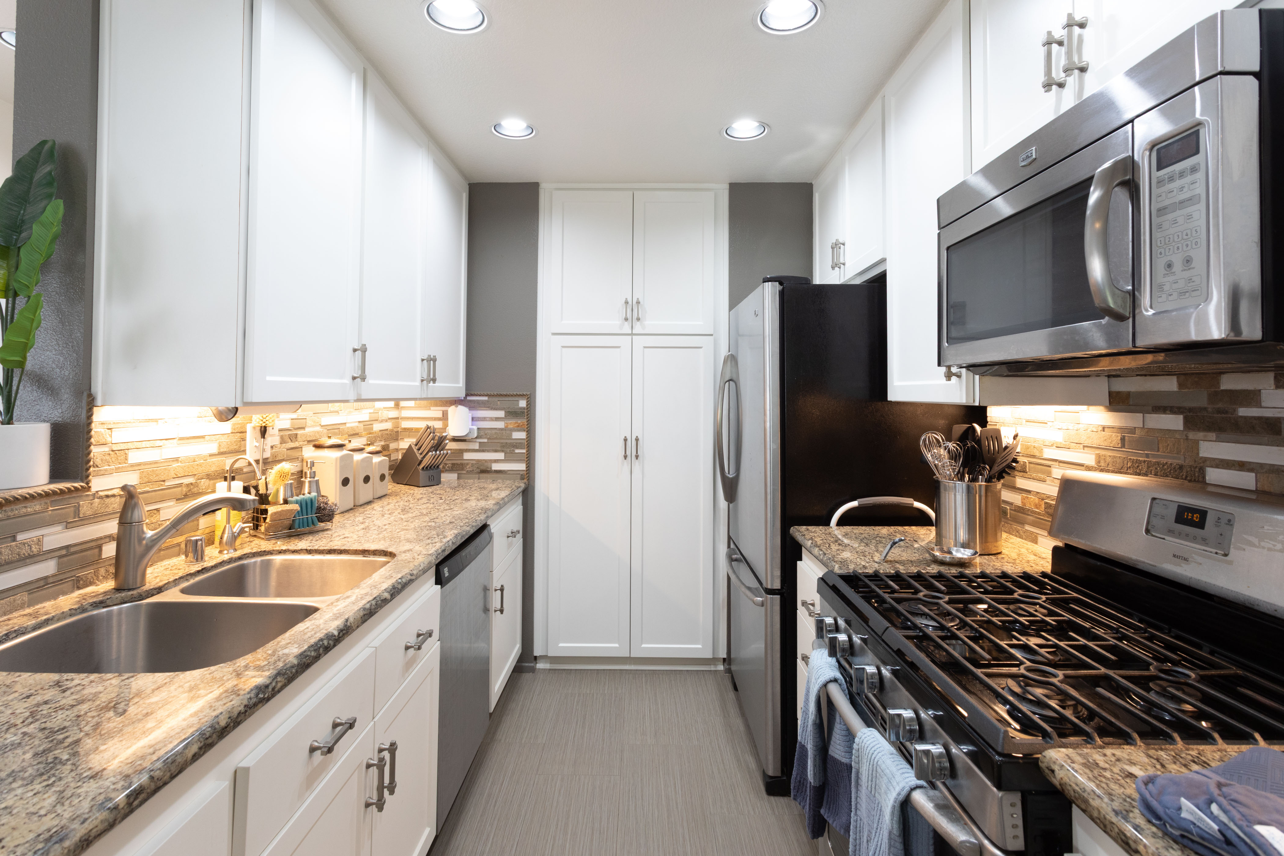 The kitchen is both refined & practical, featuring crisp white cabinetry with soft-close drawers, pull-out drawers, a spice cabinet, a large closet-size pantry, under-cabinet lighting, recessed lighting, & a silverware organizer. Granite countertops, stainless steel appliances, & ample prep space make it ideal for a gourmet chef, entertaining, & everyday living.