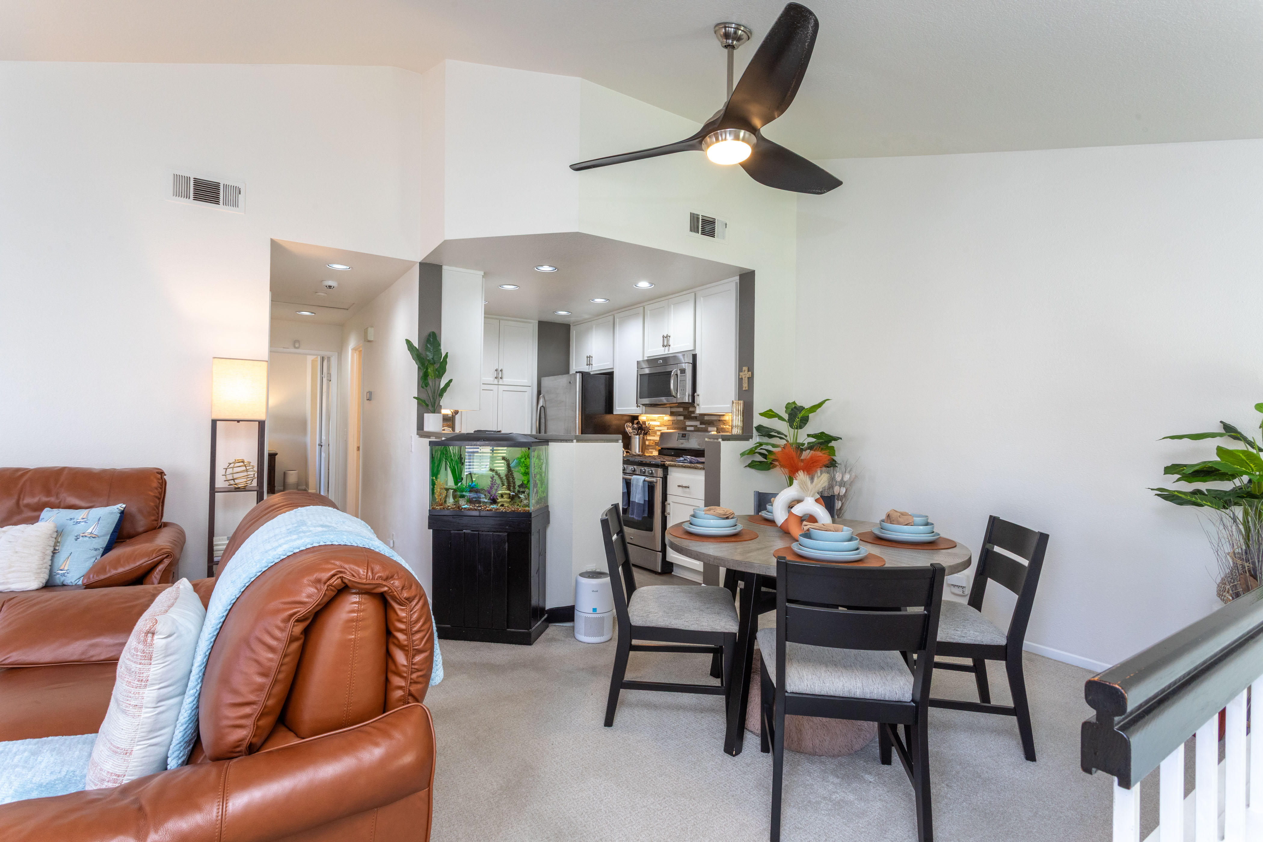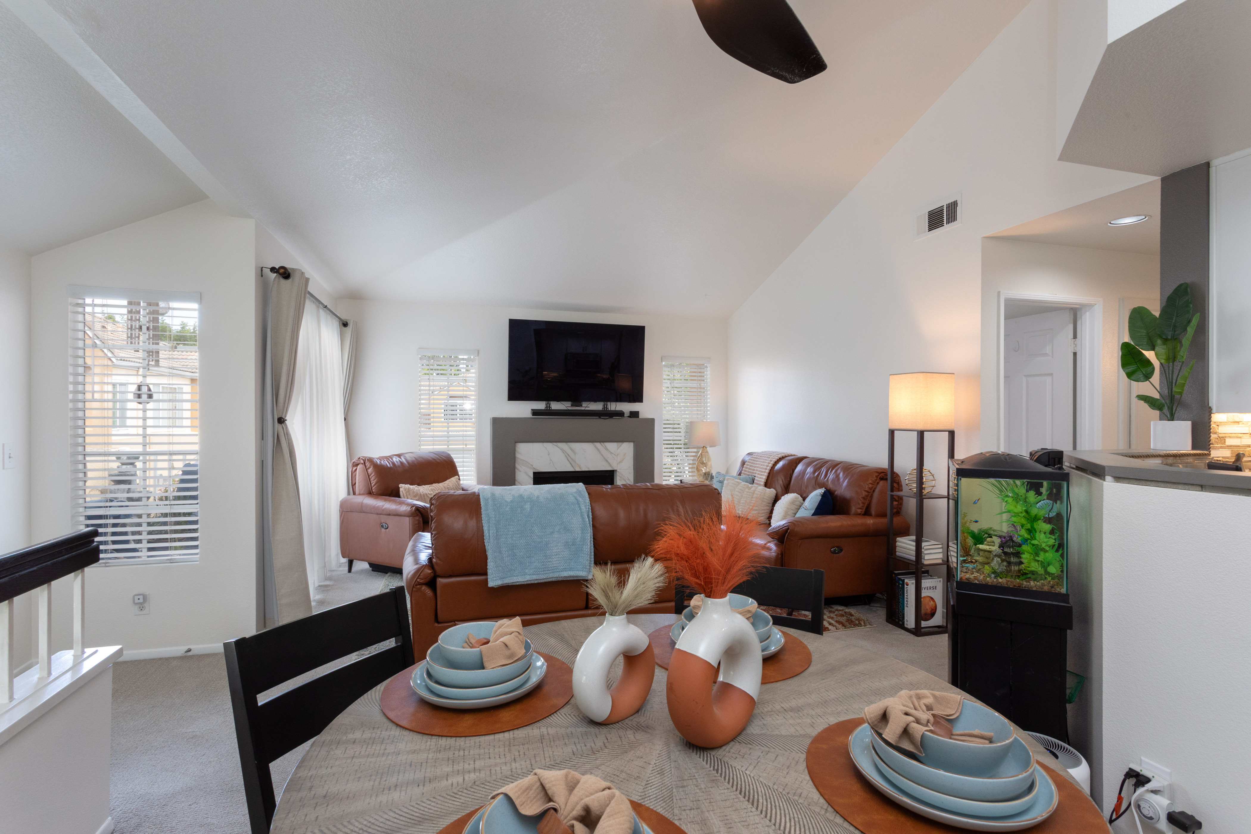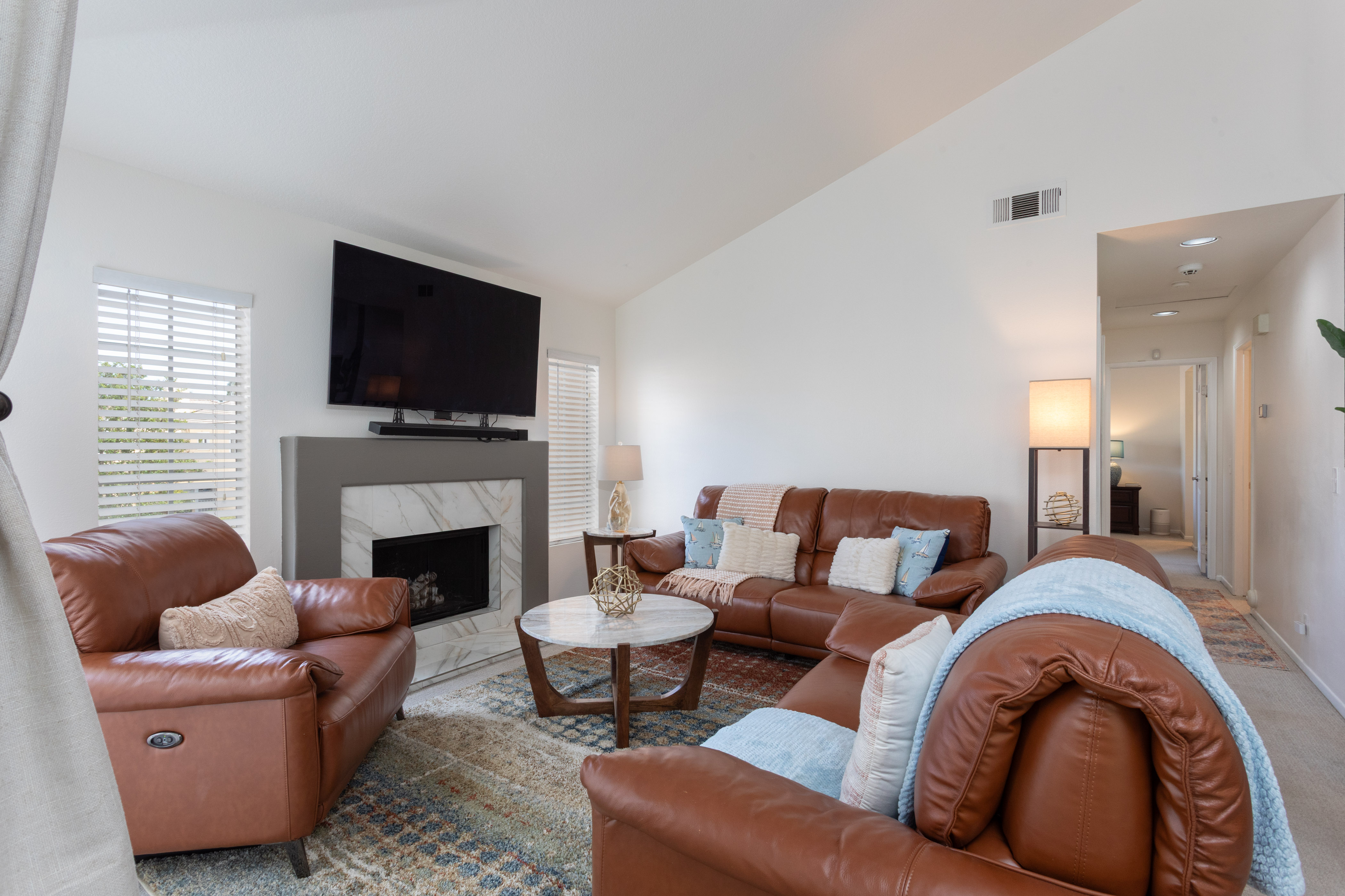 The living room centers around a marble tile inset gas fireplace, complemented by a pull-down TV mount that blends form & function. The home's relaxed & balanced atmosphere is reinforced by the air conditioning & powerful three-blade ceiling fan in the spacious dining room.