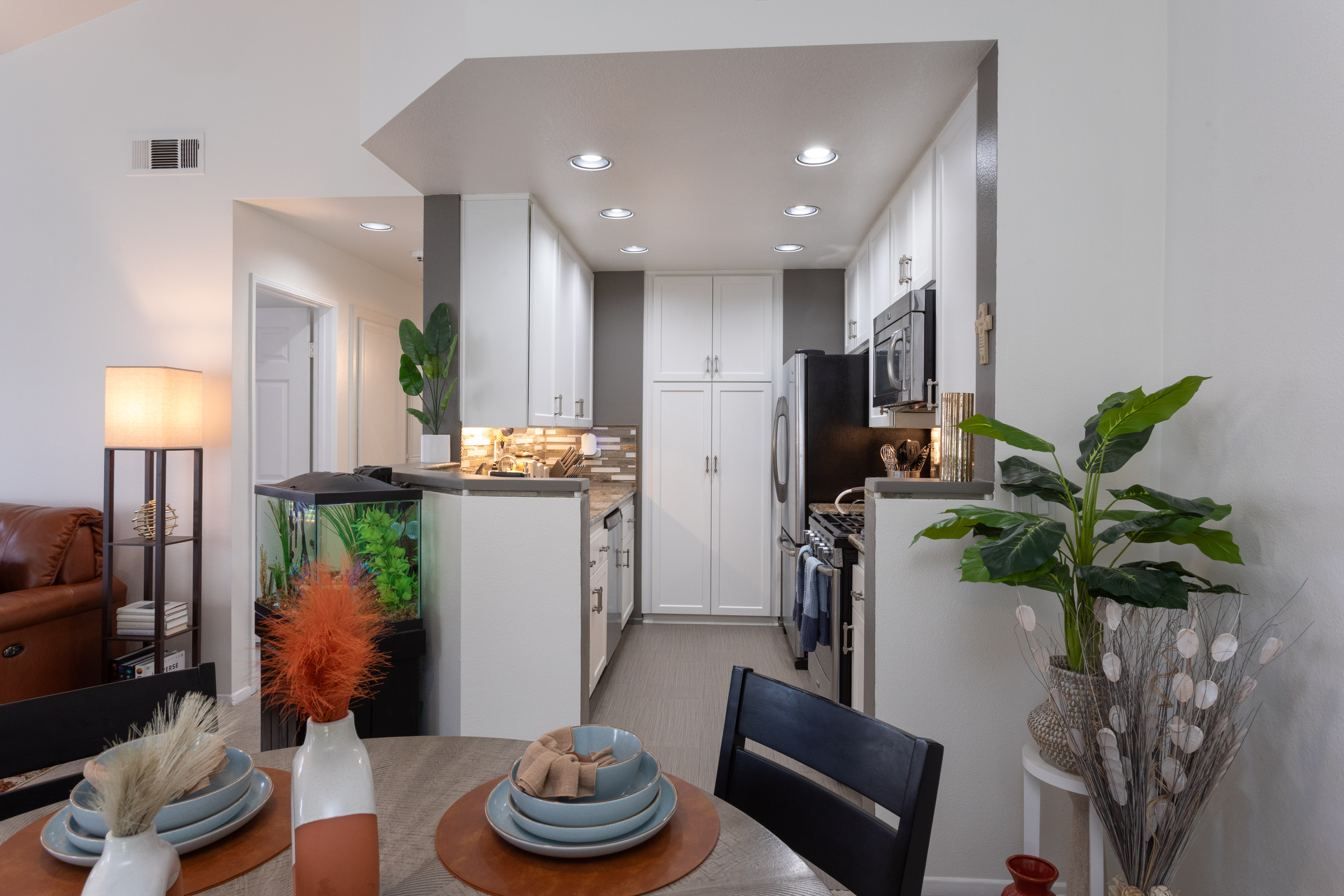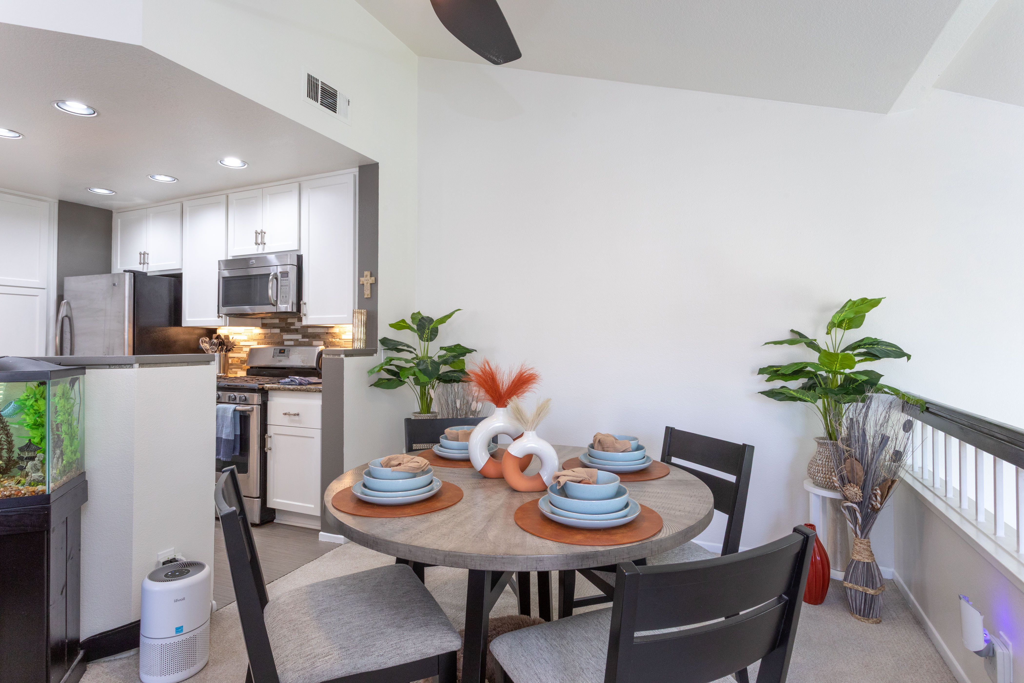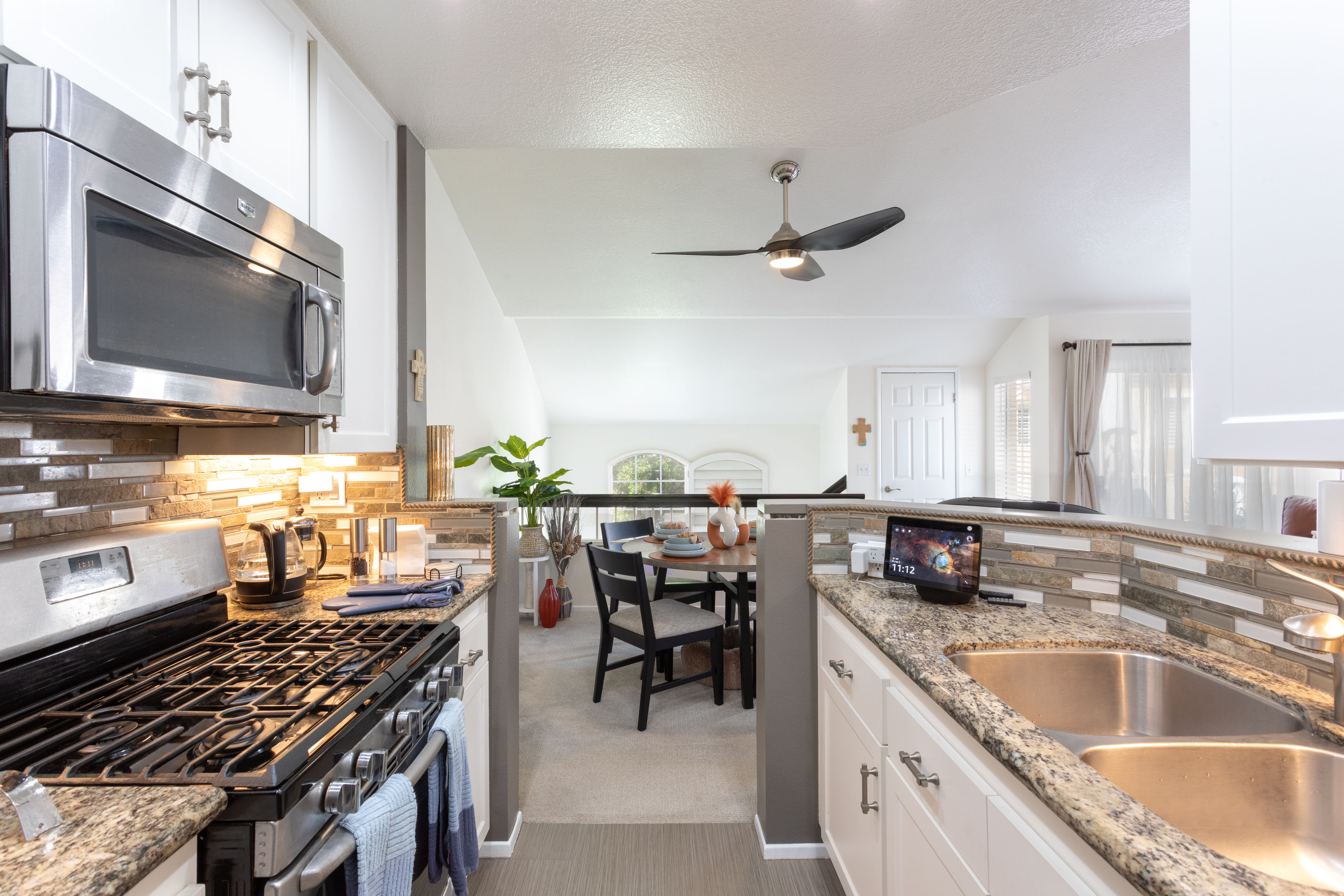 The living room centers around a marble tile inset gas fireplace, complemented by a pull-down TV mount that blends form & function. The home's relaxed & balanced atmosphere is reinforced by the air conditioning & powerful three-blade ceiling fan in the spacious dining room.