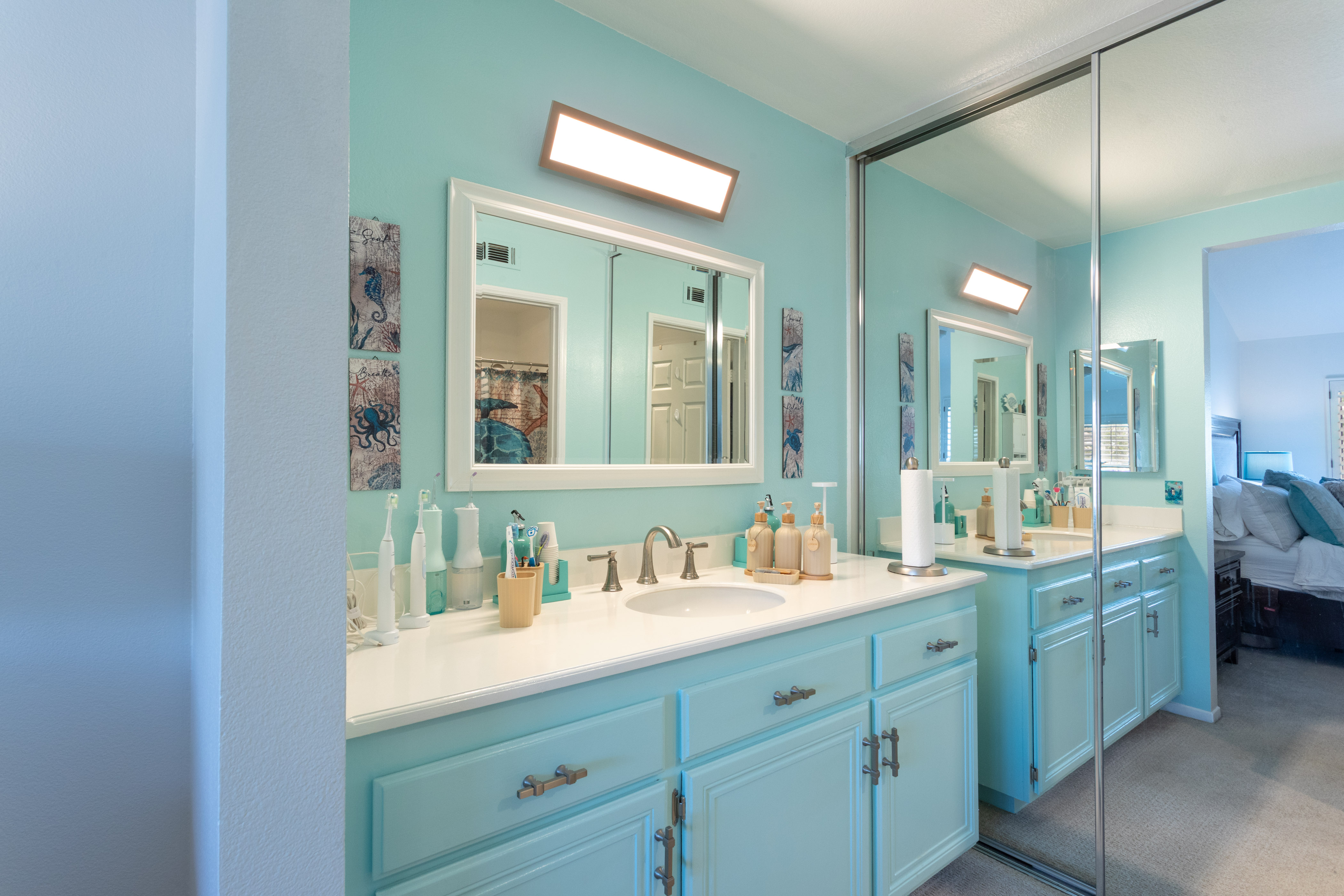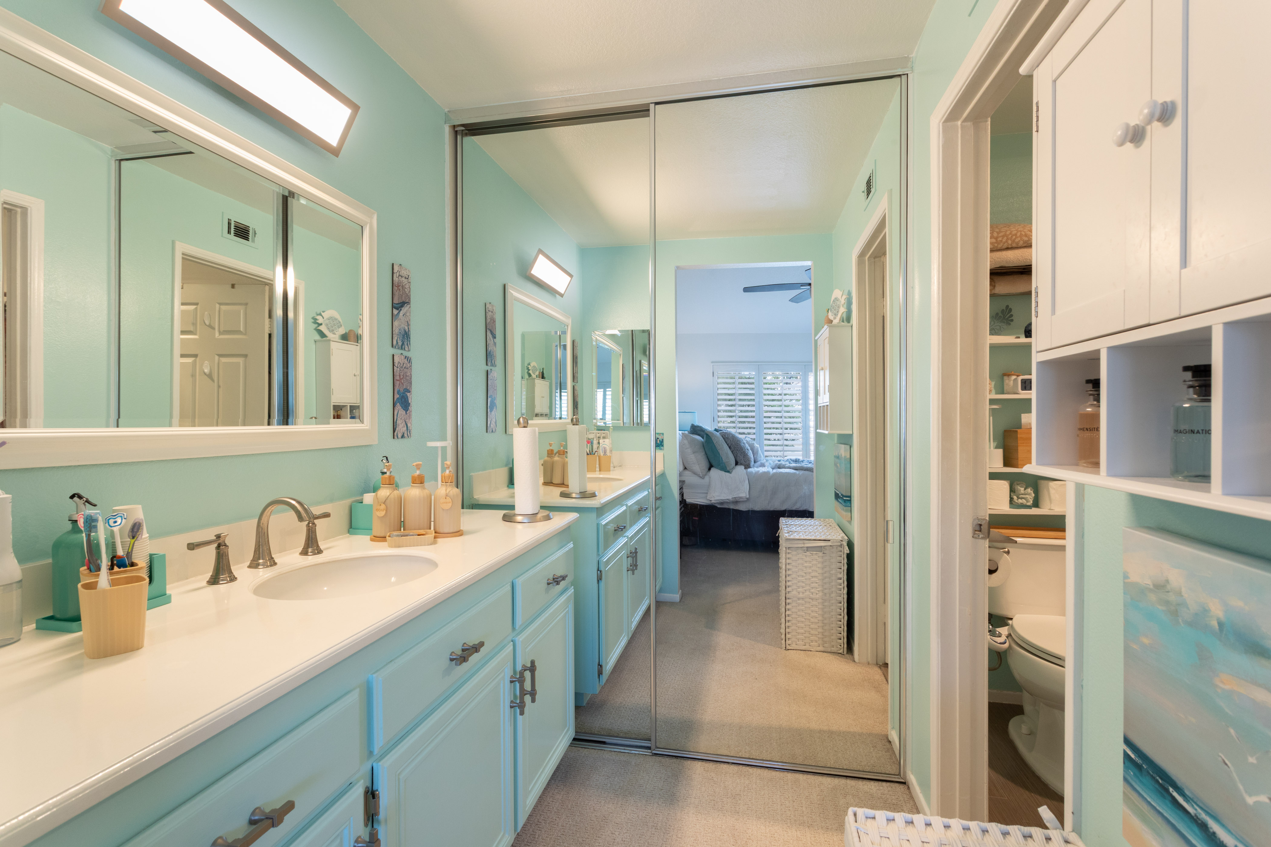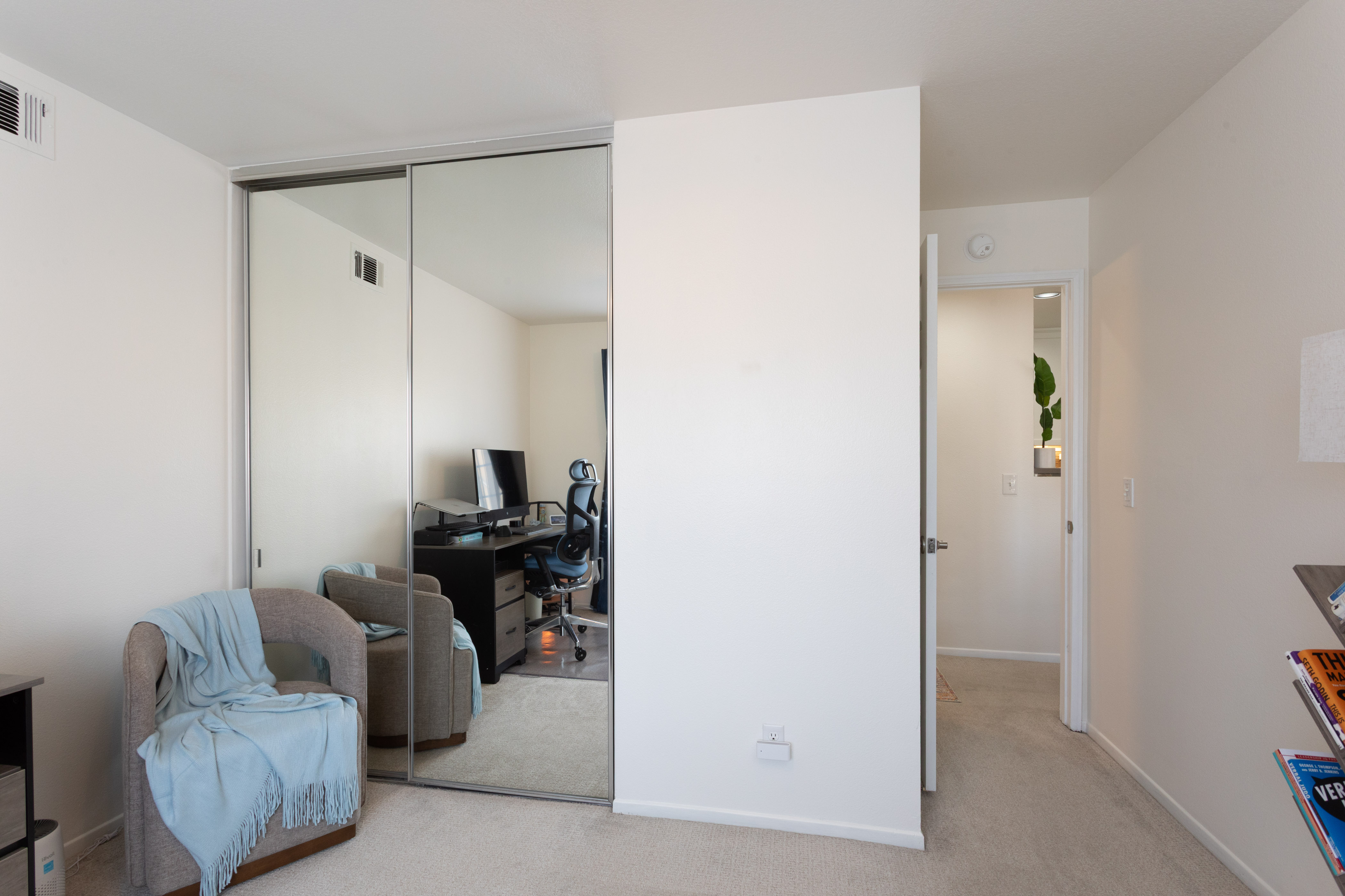 A secondary bedroom provides flexibility for guests, a home office, or creative space & includes a ceiling fan, closet organizer & mirrored wardrobe doors, while the nearby bathroom features a second LUXE bidet & coordinated finishes.