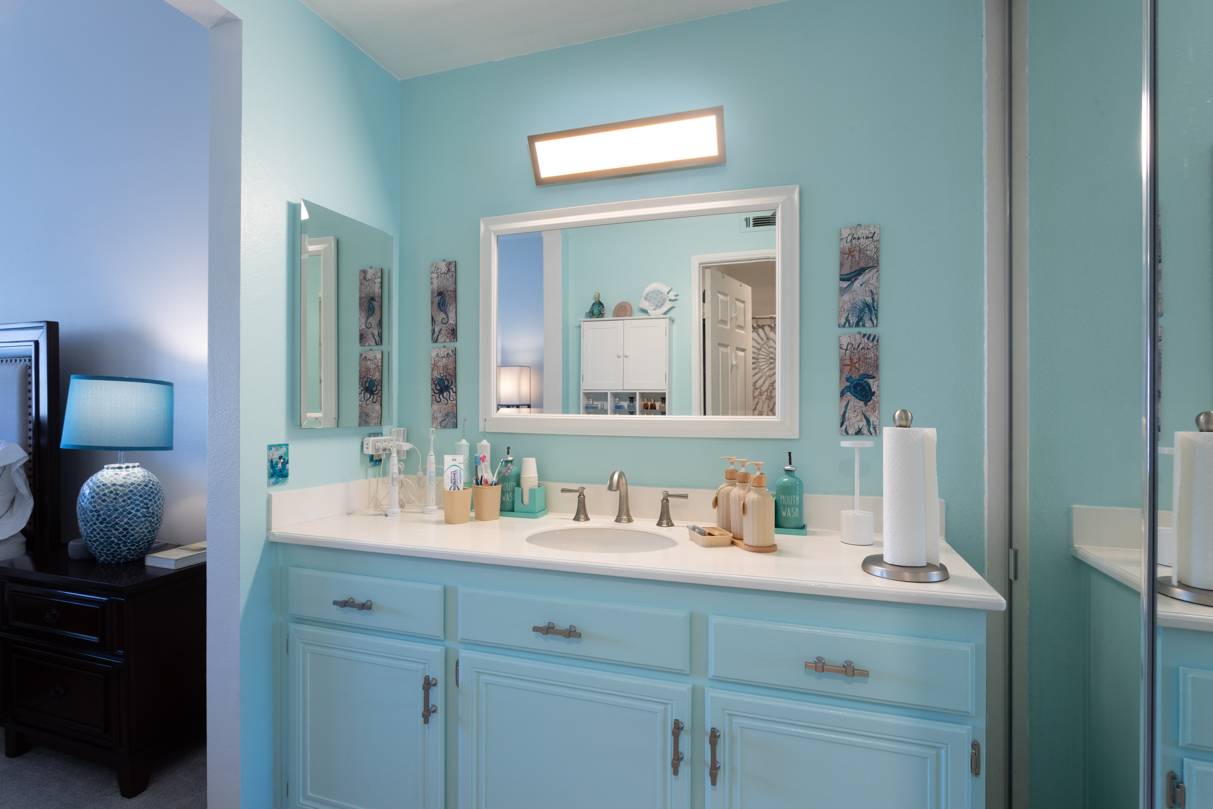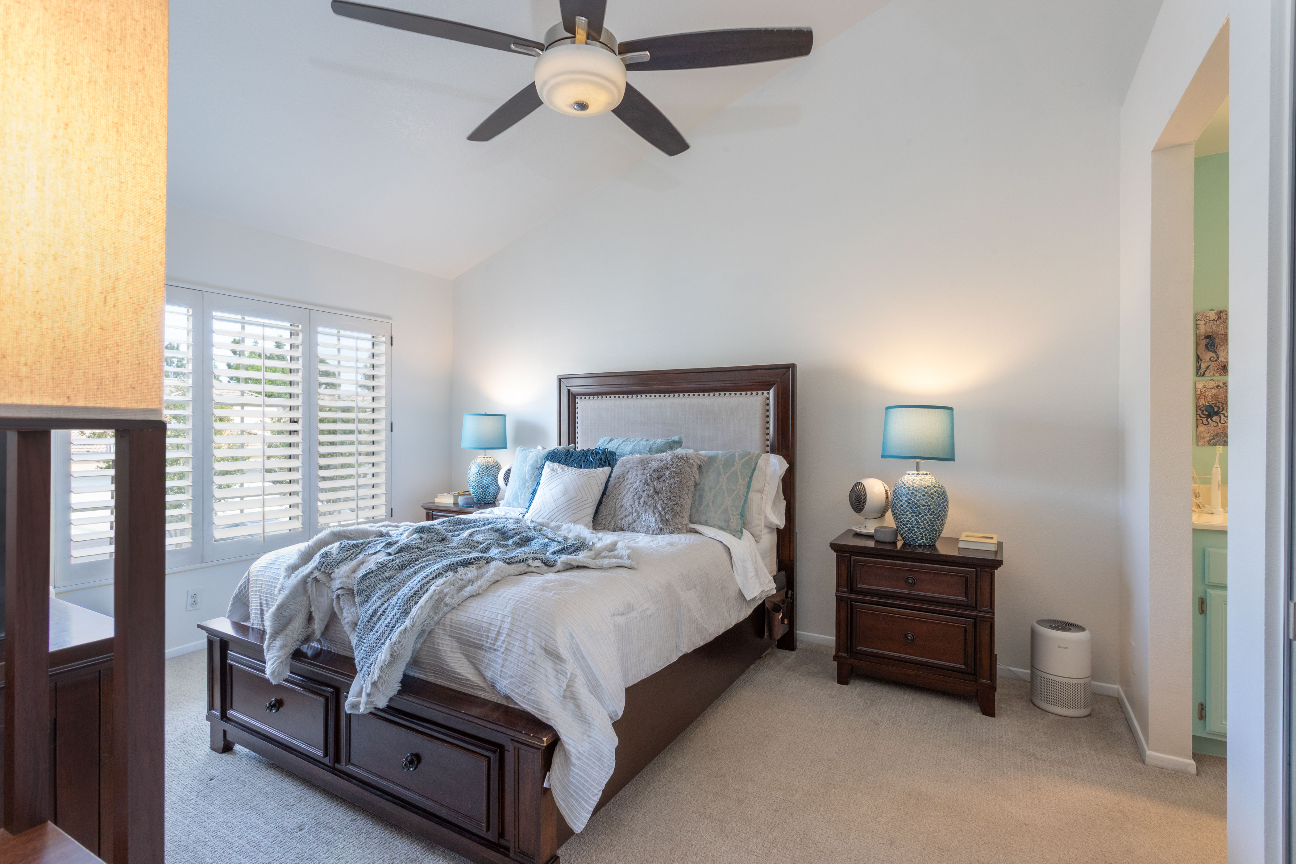 The primary suite offers a calming retreat with vaulted ceilings, mirrored wardrobe doors, custom closet organizers, & additional storage above the closets. The en-suite bathroom features generous counter space & linen storage, a 2nd closet, a LUXE bidet, & clean, coastal-inspired finishes.