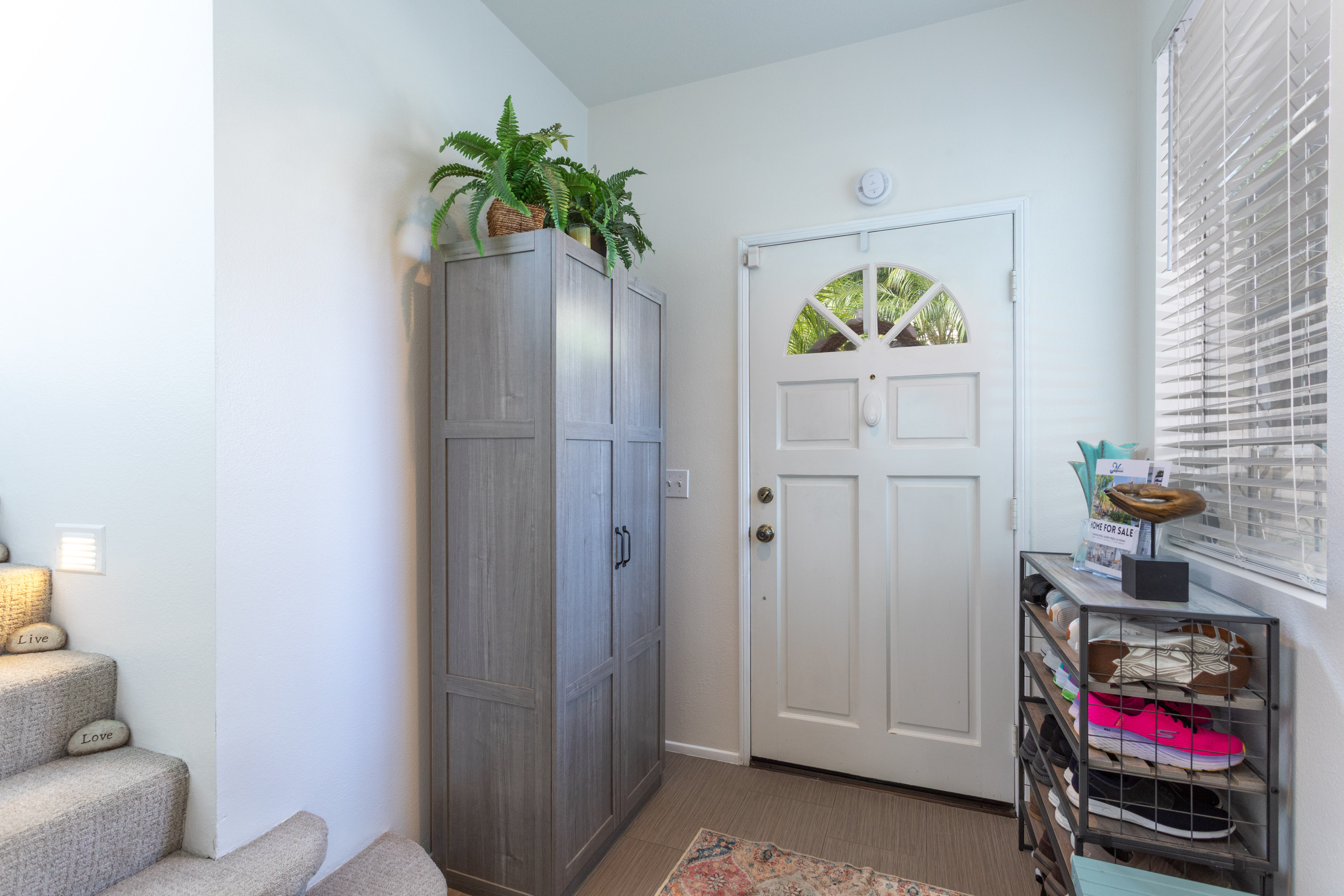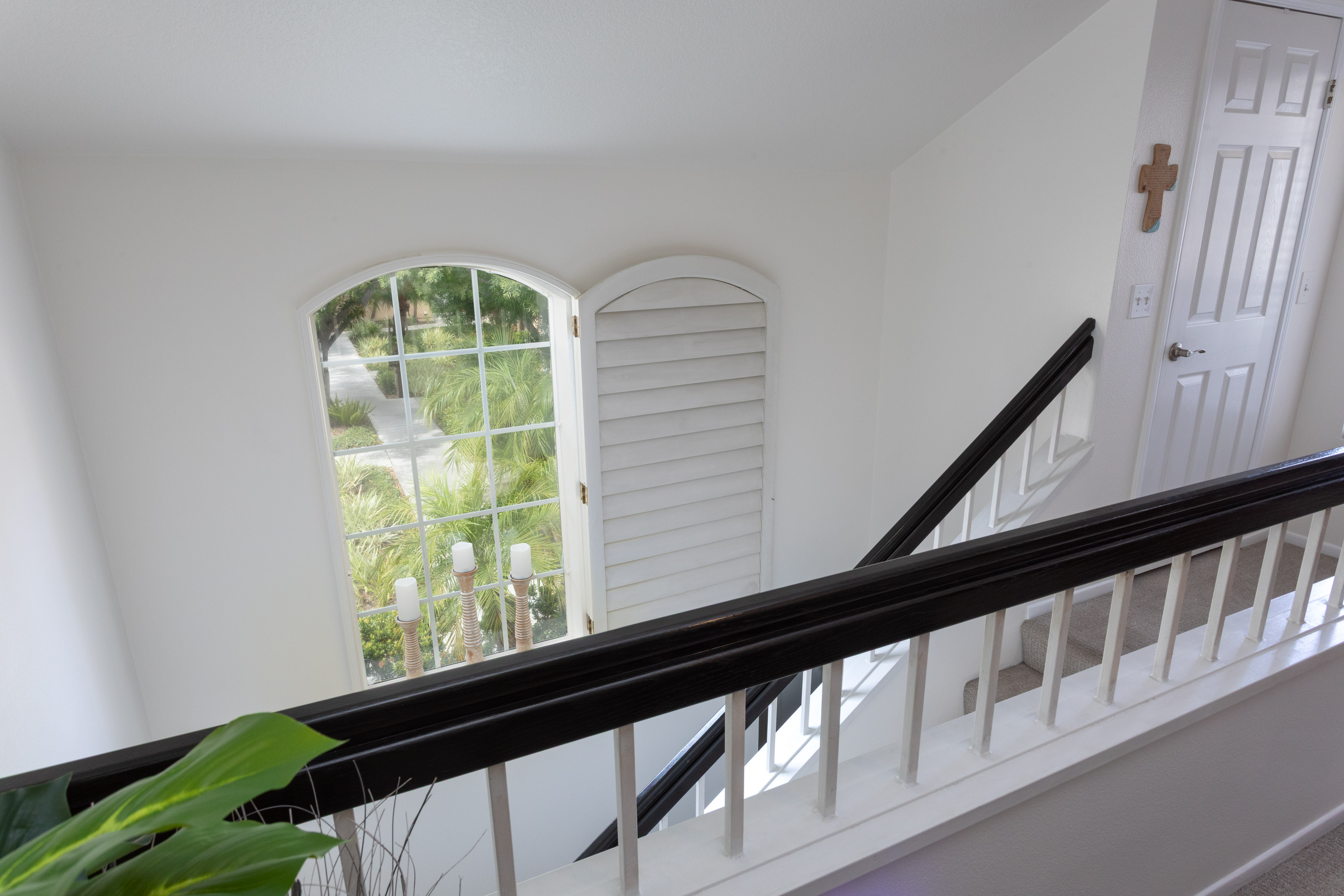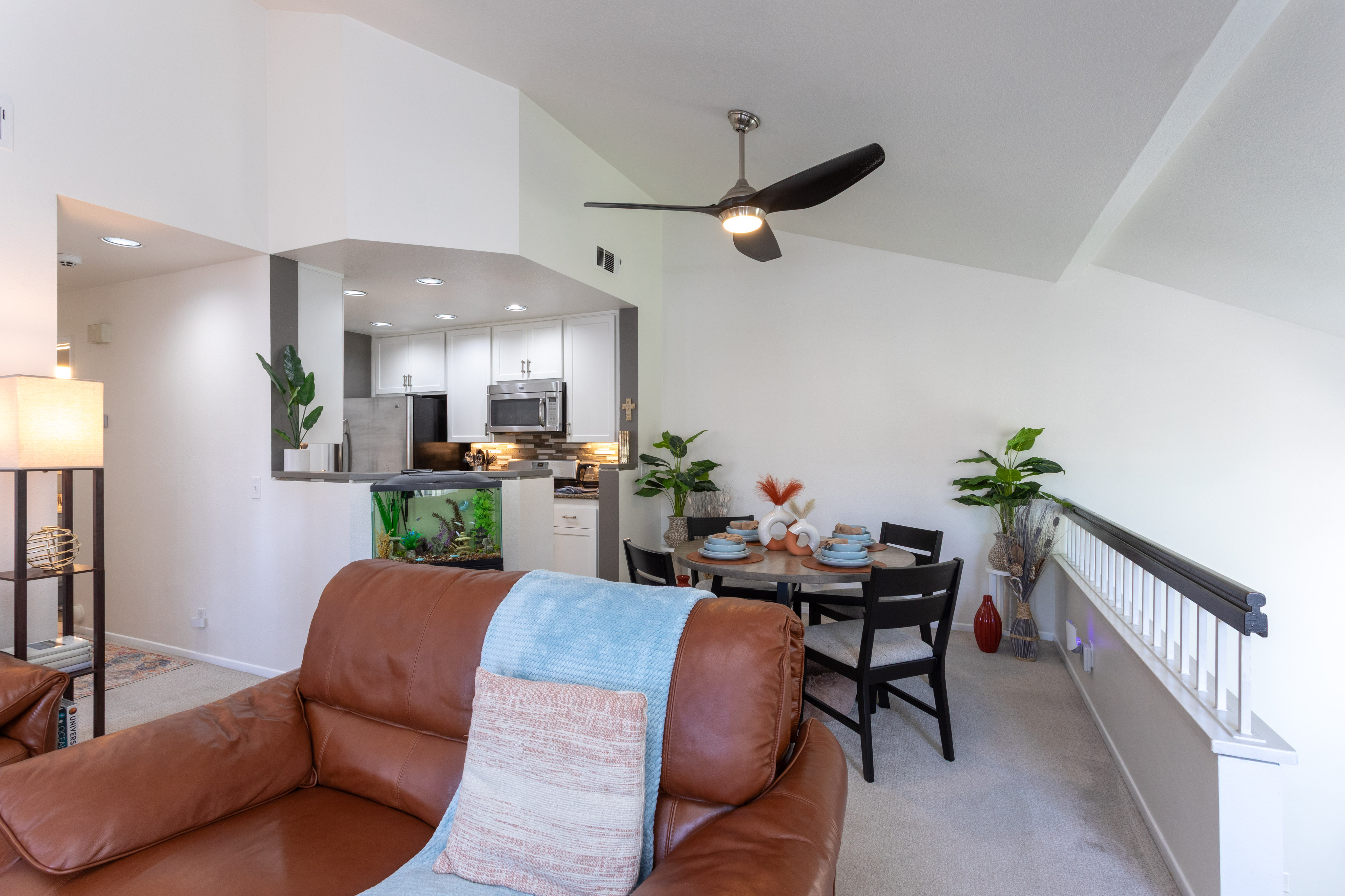 Once upstairs, vaulted ceilings soar above the main living areas, enhancing the airy, light-filled layout. Dual-pane windows with decorative grids & plantation shutters allow sunlight to filter in beautifully, while designer carpet & linen-style porcelain tile add warmth & texture underfoot.
