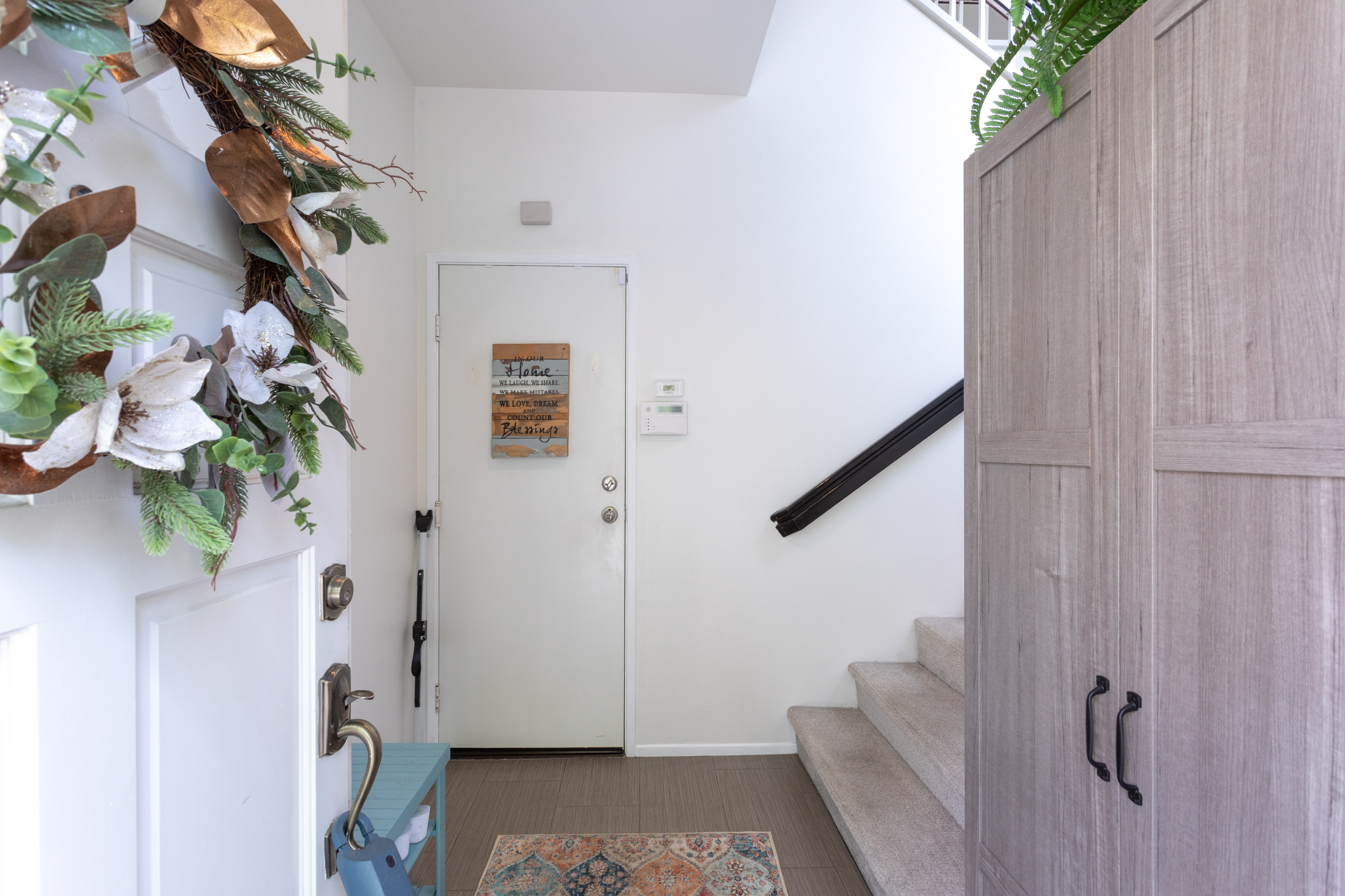 There’s a quiet sense of ease the moment you arrive—a feeling of being gently set apart from the outside world. This thoughtfully designed home welcomes you through a private entry foyer, offering a natural transition before you ascend to the main living level. With all primary living spaces thoughtfully positioned upstairs, the home enjoys a peaceful, elevated feel—removed from street activity & grounded in light, openness, & calm.